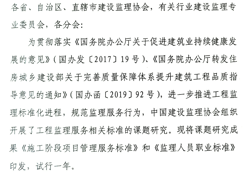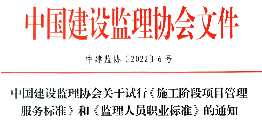 近日,中国建设监理协会官网印发试行《施工阶段项目管理服务标准》和《监理人员职业标准》的通知。